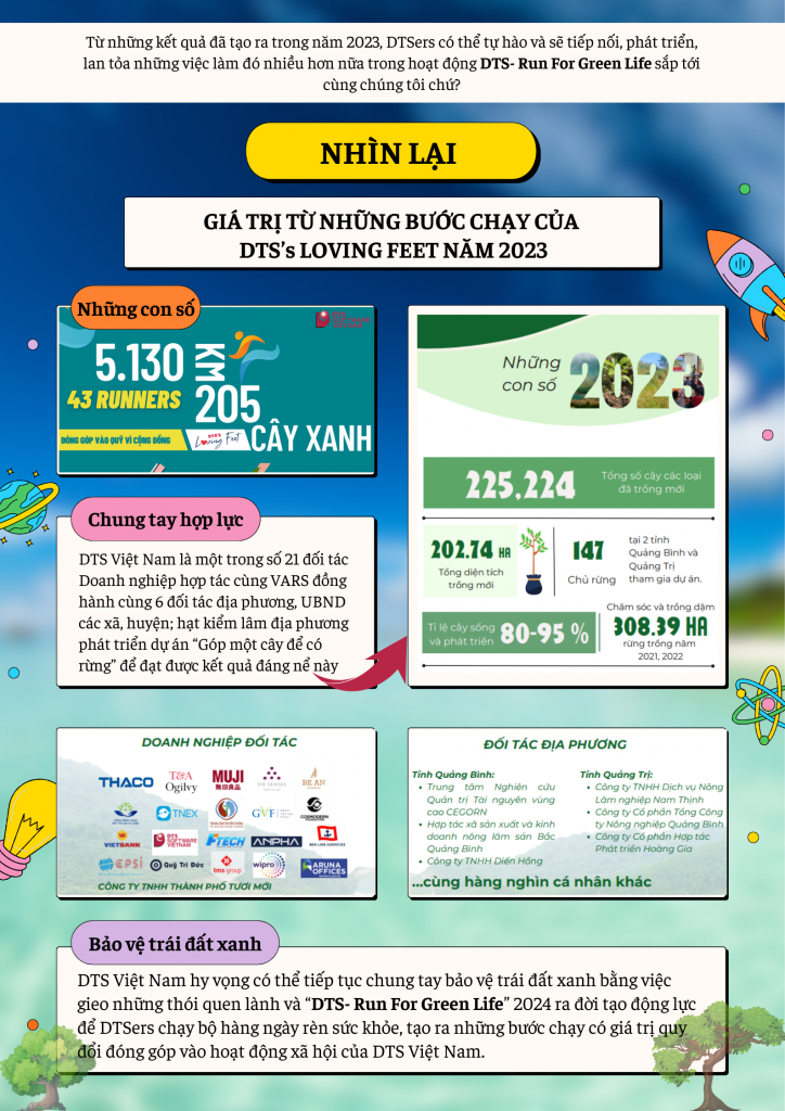 DTS Vietnam hopes to continue inspiring healthy habits and spreading these positive actions to all members. Together, let’s protect our green planet through the upcoming “DTS – Run For Green Life” event, contributing even more trees to the “Plant a Tree to Grow a Forest” project and building on the good we accomplished in 2023.